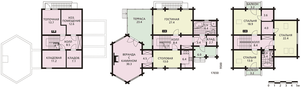 Неповторимость и безусловную привлекательность этому бревенчатому дому придают шестигранная веранда и смежная с ней просторная терраса. С жилой частью дома веранда соединена через небольшой тамбур. На веранде предусмотрен камин, придающий дополнительный комфорт этому помещению. Сам дом достаточно традиционен, это бревенчатый одноэтажный сруб с мансардой. На первом этаже расположены гостевые помещения: просторная гостиная, кухня, столовая и хозяйственные помещения. Мансарда – традиционно спальная зона дома. Она решена предельно рационально, три спальни и ванная комната группируются вокруг небольшого холла. Спальни имеют дополнительное освещение через окна верхнего света.