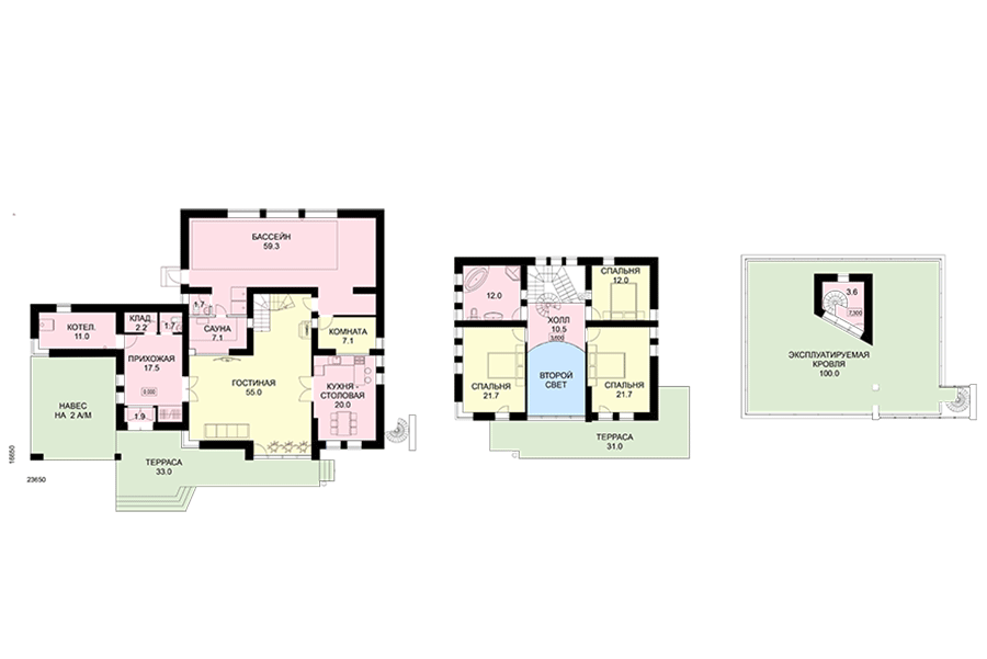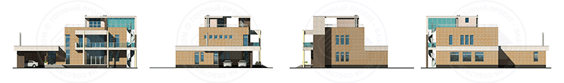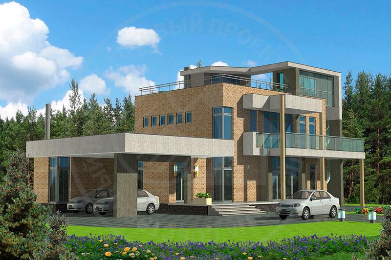Современный двухэтажный загородный коттедж, запроектированный в стиле функционализма. Дом с большой открытой террасой, примыкающей к гостиной, тонко прорисованными архитектурными деталями и удобной планировкой помещений. В районе главного входа организована крытая парковка на два автомобиля. Здание без подвала и цокольного этажа. Планировка первого этажа решена в свободной манере, что создает насыщенный интерьер центрального пространства. Входная группа с гардеробом, санузлом и кладовой ведет в основной объем дома. К прихожей примыкает котельная, изолированная от основного объема дома. Просторная двухсветная гостиная с примыкающей столовой образуют единое анфиладное пространство. В гостиной широкий двухсветный витраж, в глубине парадная открытая лестница, здесь же камин. За лестницей находится блок бассейна с сауной. На втором этаже три спальни и ванная комната, они сгруппированы по обе стороны центрального пространства холла, с которого открывается впечатляющий вид в пространство гостиной и сквозь двухсветный витраж на окрестности. Из двух спален выход на большую лоджию с остекленным ограждением. Винтовая лестница ведет из холла второго этажа в павильон на террасе кровли над вторым этажом. На эту обзорную террасу организован дополнительный доступ открытой винтовой лестницей с навесом, под которым можно иметь зону барбекю.