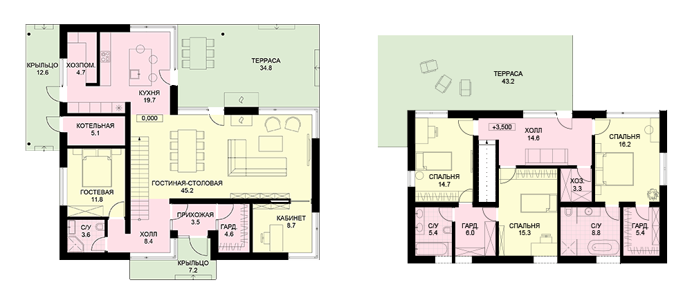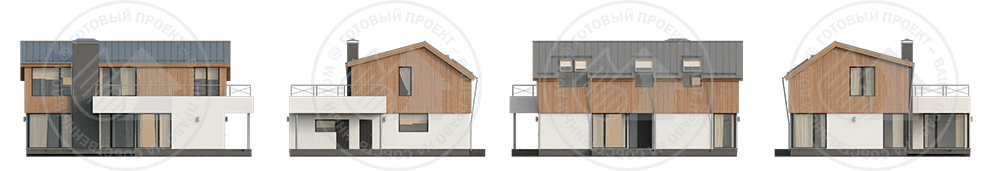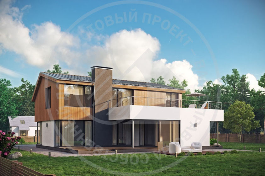 Данный проект создан на основе проекта 3048-0. Сохраняя те же объемно-планировочные решения L-3048-0 , предлагает другой, более экономичный вариант фасадной отделки, и традиционную открытую водосточную систему. Стены второго этажа зашиты вертикальной доской различной ширины, что создает дополнительную декоративность и оригинальность. Светлая штукатурка нижнего яруса придает легкость и цельность композиции дома. Кухня и хозяйственная зона, расположенные в выступающем объеме, зонированы по отношению к гостиной. Светлый лестничный холл с выходом на обширную террасу можно частично закрыть с помощью складных навесов-маркиз. Две детские имеют общий санузел и гардеробную, что экономит пространство и делает планировку максимально эффективной. Хозяйская зона включает в себя просторный приватный санузел с карнизным окном и гардеробную