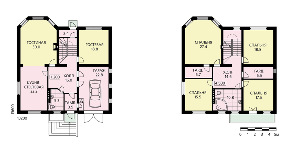 Компактный и очень вместительный двухэтажный особняк. В плане дом представляет собой квадрат, строгую геометрию которого нарушает трехгранный эркер гостиной. Дом имеет два полноценных жилых этажа, чердачное пространство и небольшой подвал, в котором расположены котельная и сауна (на планах не показан). Первый этаж – традиционно гостевая зона дома, которая в данном случае дополнена еще одной жилой комнатой. Это особенно удобно для семьи, состоящей из нескольких поколений. Несомненным достоинством является и наличие двух входов в дом, которые превращают два его противоположных фасада в равноценно главные. На втором этаже находится спальная зона. Четыре спальни группируются здесь вокруг небольшого холла, они оборудованы двумя вместительными гардеробными и ванной комнатой. Большой и светлый чердак представляет собой резерв жилой площади дома. Площади подвала и чердака не включены в общую площадь.