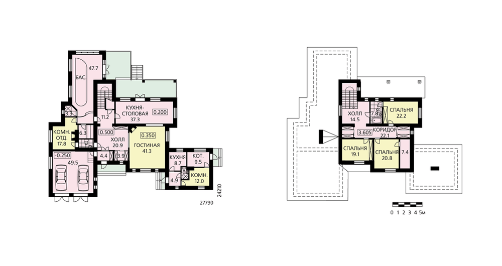 Этому сооружению подойдет название, которое определит его как многофункциональный жилой комплекс, включающий в себя жилую часть, блок релаксации, гараж и небольшую служебную пристройку. Это своеобразный вариант современной усадьбы, спроектированной под динамичный образ жизни энергичного, преуспевающего бизнесмена. Жилая часть дома двухэтажная, второй этаж – мансардный. Из холла первого этажа можно войти в гостиную и кухню, попасть в бассейн, сауну, душевую и комнату отдыха. Также из холла через тамбур можно спуститься в гараж. Входной холл непосредственно перетекает в гостиную, образуя вместе с кухней-столовой единое пространство. Из кухни и бассейна предусмотрены выходы на открытую террасу. В хозяйственной пристройке расположены котельная и помещения охраны.