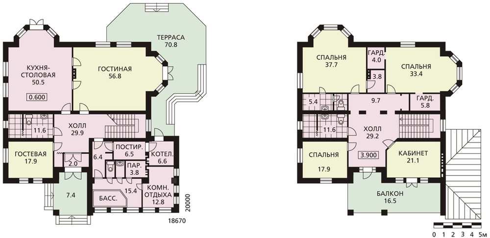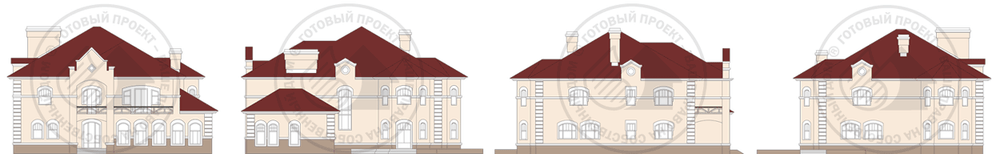 Великолепный особняк настолько же красив, насколько и комфортабелен. Выверенные пропорции, тонко прорисованные детали, продуманная отделка придают дворцовый характер этому дому. В дом предусмотрено три входа – традиционный через тамбур и холл, через котельную и летний – с террасы через эркер в гостиную. Все помещения сгруппированы в соответствии со своим назначением. На первом этаже расположены гостиная, кухня-столовая, небольшая гостевая комната. Эта жилая часть дома очень удобно связана с зоной отдыха, которая включает в себя бассейн, парную, душевую и комнату отдыха. Расположенная здесь же котельная имеет свой выход на улицу. На втором этаже три спальни и кабинет сгруппированы вокруг лестничного холла. Спальня родителей оборудована гардеробной и ванной комнатой. Смежная с ней спальня также имеет две гардеробные. Из кабинета и холла можно выйти на балкон. На чердак ведет откидная лестница.
