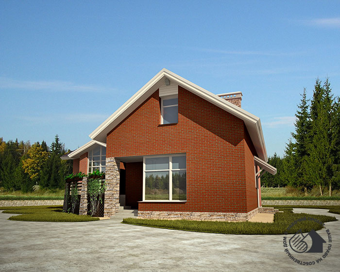 Планировка этого загородного дома выполнена с такой тщательностью и любовью к его обитателям, что трудно отказать себе в удовольствии выбрать этот проект. Дом достаточно большой, но при этом очень уютный и удобный. Комфортабельная планировка не избыточна по площадям и количеству помещений. Приоритет отдан первому этажу. Здесь расположены основные помещения дома. Большая гостиная с камином приподнята на пол-этажа выше уровня пола остальных помещений, что в значительной степени добавляет ей респектабельности. Не уступает ей и кухня-столовая – просторное светлое помещение с выходом на террасу. Терраса своим нестандартным решением привлекает особое внимание. Объединяя кухню и гостиную, она решена как уютный дворик – место сбора и отдыха всех обитателей дома. На этом этаже также расположены прихожая, котельная и небольшая гостевая. Под частью дома (под гостиной) предусмотрен подвал, который используется для хозяйственных целей и размещения сауны. В мансарде расположились две спальни с единой ванной комнатой и кладовая.