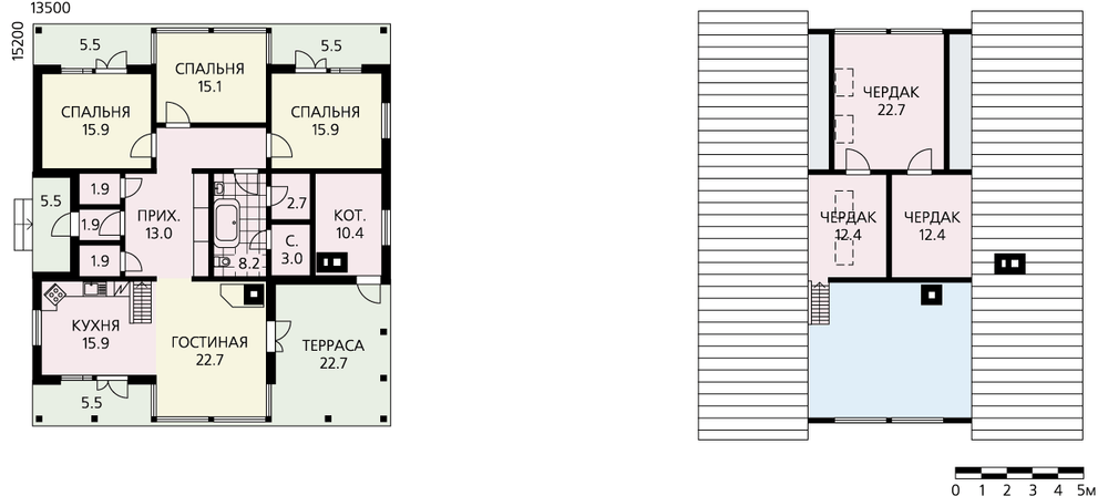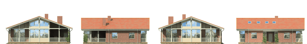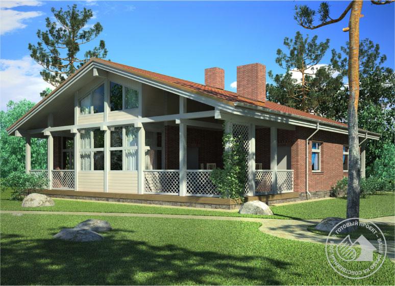 Одноэтажный каркасный дом с чердаком, в котором все жилые помещения расположены на одном этаже. На чердаке находятся еще три помещения, использование которых проектом не предусмотрено. Их назначение определят владельцы дома. Первый же этаж очень активно используется, он максимально насыщен. Здесь удобно сблокированы все функциональные зоны дома: гостевая, спальная и зона релаксации. В центре расположен холл, который и связывает их все между собой. Справа, расположены гостиная и кухня. Из кухни небольшая лестница ведет на чердак. Гостиная двусветная, с камином и выходом на просторную террасу. Слева объединенные небольшим коридором – три спальни. А в центре, прямо напротив входа, единым блоком расположены ванная, сауна, постирочная и котельная со своим выходом на улицу. Надо отметить, что кроме большой террасы, между гостиной и котельной, проектом предусмотрены еще три, небольшие, дополняющие планировку и придающие ей дополнительную комфортность общей площадью 44.7 м.кв.