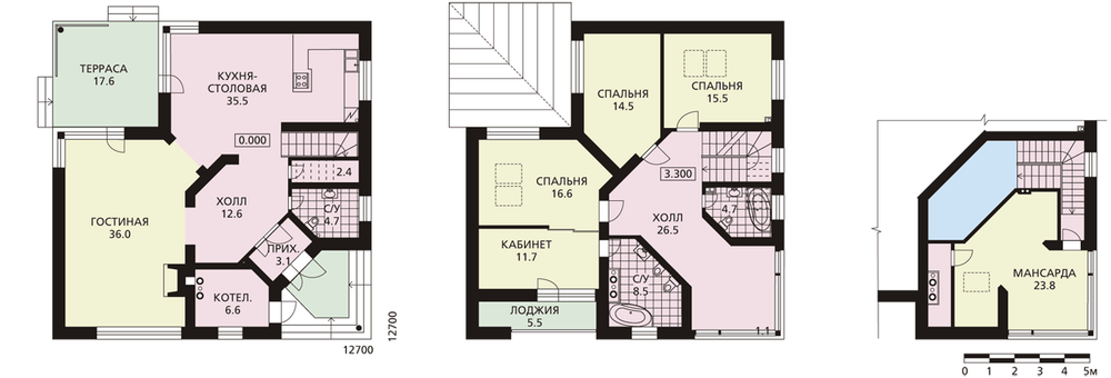 Эффектный и даже экстравагантный коттедж с угловым решением входа. Запоминающийся образ и в то же время простой и функциональный план – основные положительные черты этого проекта. Расположение основного входа с угла усиливает впечатление «взлетающей» крыши, и дом в этом ракурсе смотрится наиболее эффектно. План дома вписан в квадрат и практически симметричен относительно диагональной оси. Впечатление, полученное при подходе к дому, усиливается, когда вы попадаете внутрь. В центре первого этажа расположен большой холл, из которого можно пройти в гостиную, столовую или по лестнице на второй этаж. На втором этаже находятся три спальни, одна из которых имеет отгороженный кабинет и ванную комнату. В доме есть еще третий уровень, где размещены холл и мансардное помещение, назначение которого может быть разнообразным.
