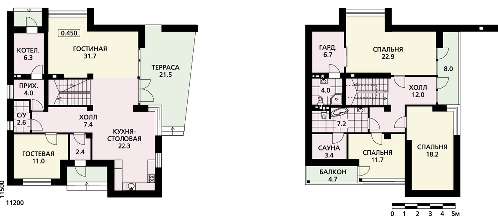 Современный дом в стилистике неомодерна. Односкатная кровля, конструктивные элементы, использованные в решении фасадов, асимметричная терраса создают своеобразный, запоминающийся и достаточно нестандартный облик дома. Он не похож на традиционные загородные коттеджи с привычными двускатными кровлями, башенками и эркерами – это постройка нового поколения. И таковых в нашей коллекции становится все больше, например близкий родственник – проект E-1398-0. Эти два дома выдержаны в одной стилистике, но отличаются по площади и планировке. В данном случае дом имеет большую площадь. Планировка первого этажа решена в свободной манере и почти полностью занята гостиной, кухней-столовой и холлом, решенными в одном пространстве. Также на первом этаже размещены небольшая жилая комната, санузел и котельная. Котельная имеет свою прихожую-буфер, которая отделяет ее от жилых помещений. Она может быть совмещена с постирочной. На втором этаже расположены три спальни. Спальня родителей имеет свою гардеробную и ванную комнату и балкон. На балкон можно выйти и из холла. Для двух других спален предусмотрены ванная комната и сауна.