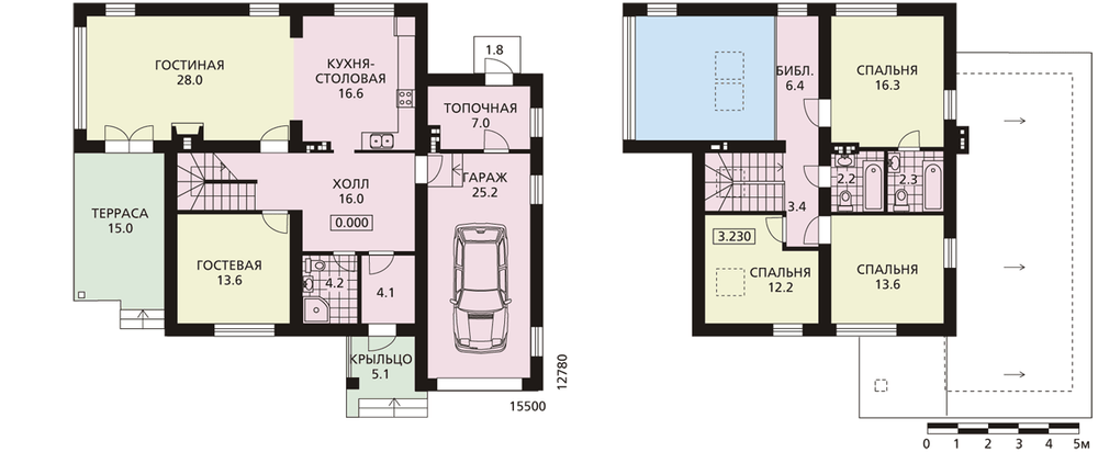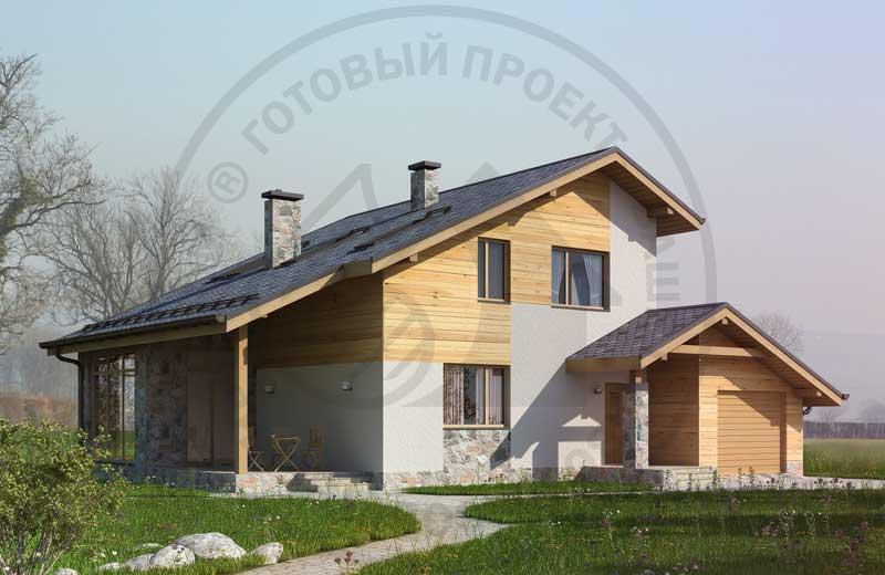Двухэтажный жилой дом с отапливаемым гаражом рассчитан на проживание семьи из трех-пяти человек. Центр дома - холл, из которого можно попасть в любую комнату первого этажа, а также подняться в мансарду. На первом этаже находятся гостевая комната, двусветная гостиная, имеющая выход на террасу, и хозяйственные помещения. В мансарде расположены три спальни и два санузла. В коридоре можно обустроить библиотеку.