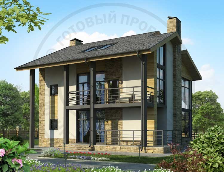 Современный, красивый коттедж с интересным вариантом углового остекления. Угловой витраж с легкими переплетами без простенков и массивных колонн создает ощущение воздушности и свободы. В доме запроектировано два этажа и жилая мансарда, без подвала. На первом этаже расположены гостиная и кухня-столовая, котельная(автономная), со своим выходом на улицу. На втором этаже находится три спальни и ванная комната. В мансарде можно устроить мастерскую, библиотеку, домашний кинотеатр.