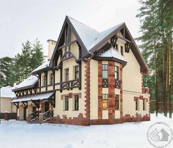 Проект респектабельного коттеджа выполнен в лучших традициях загородной архитектуры. Удачное решение фасадов в западноевропейском стиле создает образ, не подвластный времени. Неповторимое очарование дому придает островерхая крыша, а темный цвет деревянных деталей, контрастируя со светлыми оштукатуренными стенами, еще больше подчеркивает традиционность стиля. Комфортабельная планировка обеспечивает прекрасную взаимосвязь всех помещений дома. С одной стороны от входа расположены гостиная и смежная с ней кухня, с другой – комфортабельный блок с сауной и бассейном, напротив входа – небольшая спальня. Кухня и спальня имеют выходы на террасы. Уютная приватная зона мансардного этажа с тремя спальнями и ванной комнатой дополнена тренажерным залом и комнатой отдыха, из которой можно выйти на балкон. В доме есть чердак, его площадь включена в общую площадь дома.