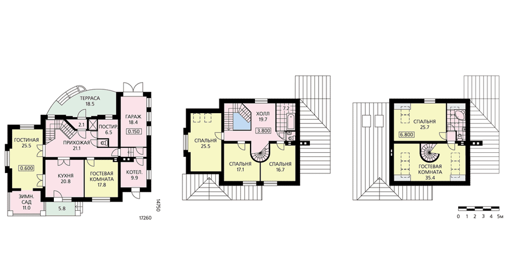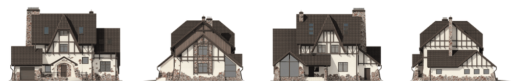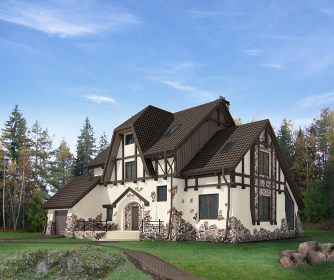 Современный, комфортабельный, вместительный коттедж в облике которого прослеживаются черты скандинавской архитектуры. Это и основательность, капитальность облика дома в целом, и высокие, крутые скаты кровли, и характер отделки фасадов с элементами фахверка и натурального камня. Внутренняя же планировка дома отвечает самым современным требованиям коттеджного строительства. Вход в дом предваряет великолепная дугообразная терраса. Из просторной прихожей есть доступ во все помещения дома, как первого этажа, так и мансарды. Мансарда представляет собой спальную зону дома с просторным светлым холлом и тремя спальными комнатами. Отсюда на чердак ведет винтовая лестница, которая, кроме коммуникационной функции играет роль выразительного декоративного элемента. Спальные помещения чердака практически полностью находятся под скатами кровли, что неизбежно приводит к появлению мансардных окон.