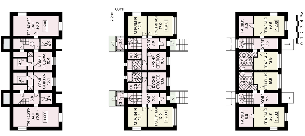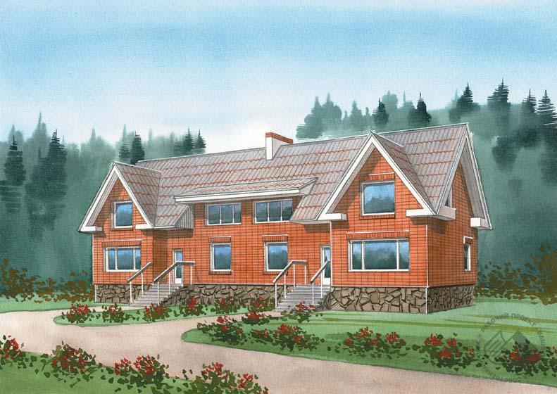 Экономичный вариант сблокированного из двух секций дома. Секции расположены зеркально. Каждая из них имеет три уровня. На первом расположены гостиная, кухня, и спальня с санитарным блоком. В мансарде – две спальни и ванная комната.Одна из спален оборудована гардеробной. В доме есть цокольный этаж, на планах он не показан. Проектам в нем предусмотрены сауна с моечной и комнатой отдыха и тренажерный зал под гостиной и спальней первого этажа.Экономичность данного решения определяется максимально рациональной планировкой, представленной только необходимыми для жизни семьи помещениями и лаконично решенными фасадами. При этом торцевые и задний фасады имеют минимальное количество окон, эти фасады практически глухие. Такое решение при незначительной корректировке позволит блокировать такие двухсекционные дома между собой, создавая застройку целых улиц.