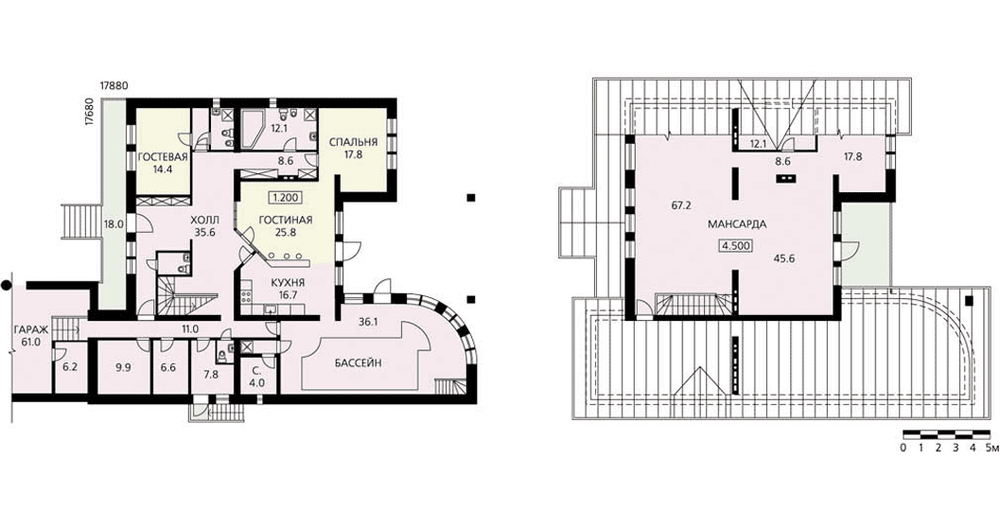 Этот просторный загородный особняк создан для отдыха и релаксации. Причем помещения для релаксации не только функциональны и удобны, им отведены самые лучшие места в доме. Так, бассейн, чаша которого сама необычной формы, расположен в красивом, светлом, необычной формы помещении. Оно напрямую связано с гостевой зоной дома. Прямо из гостиной можно пройти в бассейн и сауну. Гостиная и кухня расположены в одном помещении и лишь условно поделены барной стойкой. В этом большом доме предусмотрена только одна спальня для членов семьи и небольшая гостевая комната на первом этаже. При этом площадь мансарды по проекту не имеет определенного функционального назначения, именно ее и можно приспособить под спальные помещения, тем более что здесь предусмотрено естественное освещение и ванная комната. Большой пристроенный гараж позволит разместить машины не только членов семьи, но и гостей.