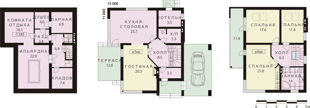 В новом варианте появился подвал, в котором разместились комната для отдыха, бильярдная, парная, душевая и кладовка.