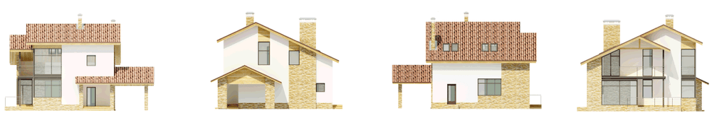 Дом одноэтажный, с мансардой, гараж заменен навесом для машины. На первом этаже расположены гостиная и кухня-столовая, автономная котельная со своим выходом на улицу. Из столовой можно выйти на террасу. Рационально решена мансарда: три спальни и небольшая ванная группируются вокруг лестничного холла, они хорошо освещены окнами верхнего света. Вариант блокировки этого проекта – проект T-1387-0.