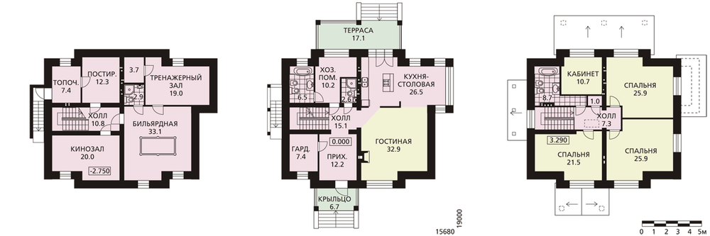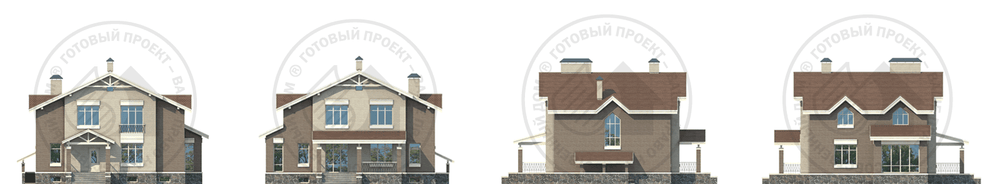У этого загородного дома много достоинств. Стилистика фасадов с квадратным эркером, двускатная крыша делают этот проект универсальным по сфере применения. А экономичность, обусловленная выбором конструктивных материалов и «выходом» полезной площади, делает дом приемлемым для горожан со средним уровнем доходов. Внутреннее пространство дома просто и рационально. В цокольном этаже находится зона отдыха: бильярдная комната, тренажерный зал, кинозал и технические помещения. Самое парадное помещение первого этажа – гостиная с камином, сообщающаяся с кухней-столовой. На втором этаже находятся три спальни и кабинет, который по мере необходимости можно переоборудовать в спальню.