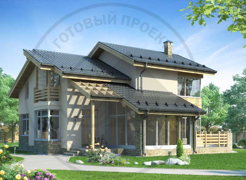 предусмотрен навес. На втором этаже размещены три спальни, две из которых имеют выходы на балконы.