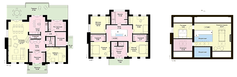 В доме три полноценных этажа. На первом этаже ядро дома — гостиная-столовая, из которой можно выйти на просторную террасу, технические помещения (котельная, постирочная), кабинет и небольшая кладовая. Второй этаж — приватная зона, здесь запланированы три спальни, две большие ванные комнаты и детская игровая комната. Третий этаж, крыша над которым оборудована мансардными окнами, вмещает большую комнату отдыха, в которой можно установить бильярд или разместить домашний кинотеатр, кладовую и комнату для гостей.