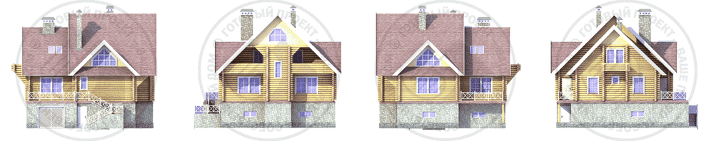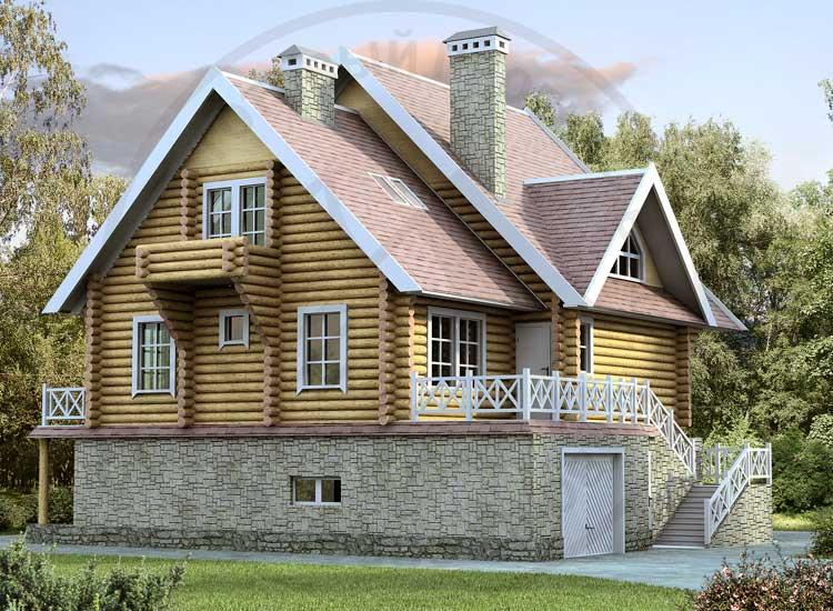 Архитектурное решение основано на традициях русского деревянного усадебного дома – это бревенчатый сруб на высоком цокольном этаже. В цоколе размещено все, что необходимо для комфортного автономного проживания семьи: гараж, подсобные помещения, комната отдыха и сауна с бассейном. Наружная открытая лестница ведет на основной, первый этаж, где через холл можно попасть в двусветную гостиную с кухней, кабинет и спальню. Мансардный этаж отдан зоне отдыха. При желании можно построить только два верхних этажа, при этом не нарушатся ни красота внешнего облика, ни функциональность планировки.