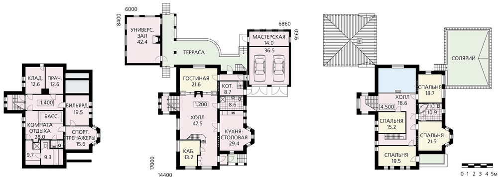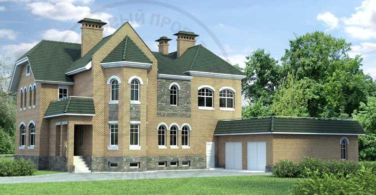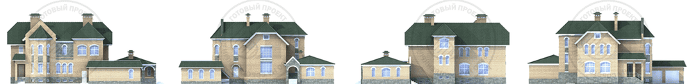 Представительный особняк для владельцев с высокими запросами. Комфорт проживания обеспечен составом помещений и их размещением. Предлагается вариант создания пространственно развитого комплекса, основным ядром которого является двухэтажный объем жилого дома. Два одноэтажных объема могут быть построены позже или отсутствовать совсем. Три постройки комплекса образуют внутренний дворик, часть которого превращена в террасу, объединяющую все три объема постройки. В одну из построек, в которой предполагается разместить гараж, можно попасть из тамбура жилой части дома. Вторая пристройка может быть оборудована по усмотрению владельцев. Просторное помещение с камином может стать универсальным залом или тренажерным залом для занятий спортом.