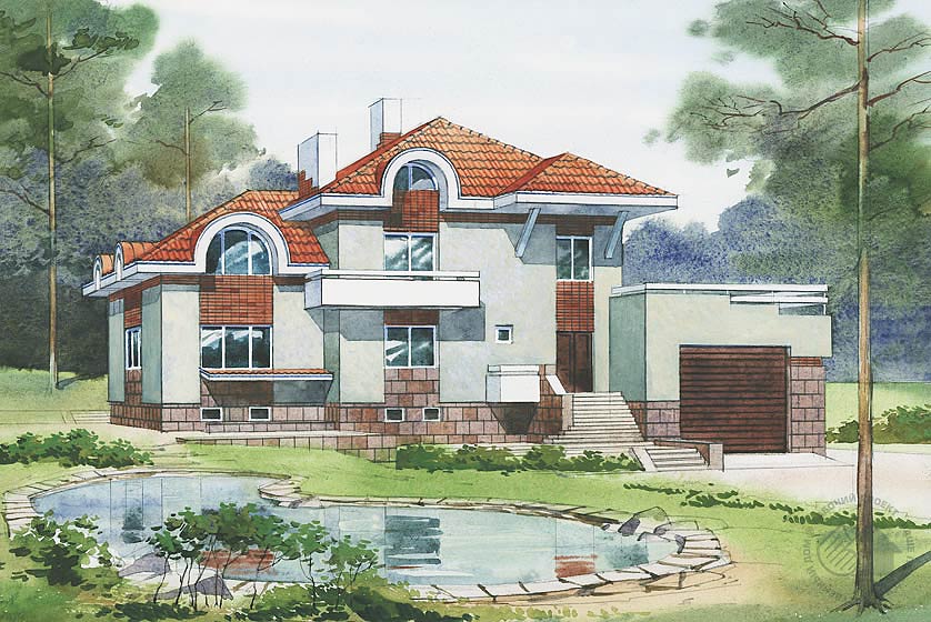 Большой, вместительный и очень комфортабельный особняк для состоятельных владельцев. Все его четыре фасада прорисованы с такой тщательностью и выразительностью, что трудно выделить главный. Такое здание должно стоять на открытом участке и иметь хороший обзор со всех сторон. В планировочном решении дом представляет собой два объема: большой – жилой и маленький, пристроенный к нему, в котором расположен гараж. Жилой объем вполне самостоятелен и может существовать без гаража. Украшением дома является большая полукруглая веранда, она может быть как открытой, так и застекленной. На площади большой светлой мансарды можно оборудовать дополнительные жилые или служебные помещения. Есть вариант с полным мансардным этажом.