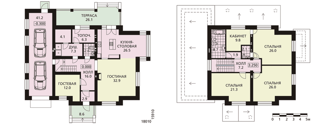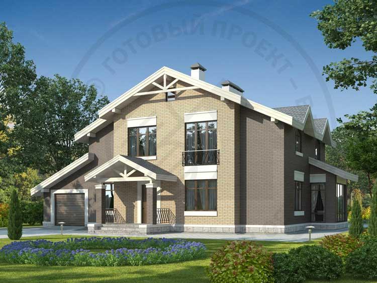 Двухэтажный современный особняк, изысканный, комфортабельный и в то же время максимально рациональный. Сочетание облицовочного кирпича разных тонов подчеркивает выразительный облик дома. Внутренняя планировка – логичная и удобная. Из небольшого холла первого этажа можно попасть в гостевую часть дома и в технический блок, состоящий из гаража, топочной и душевой. Кухня-столовая и просторная гостиная с камином образуют единое пространство. Также на первом этаже находится небольшая гостевая. На втором этаже вокруг лестничного пролета расположены три спальни, кабинет и просторная ванная комната.