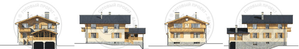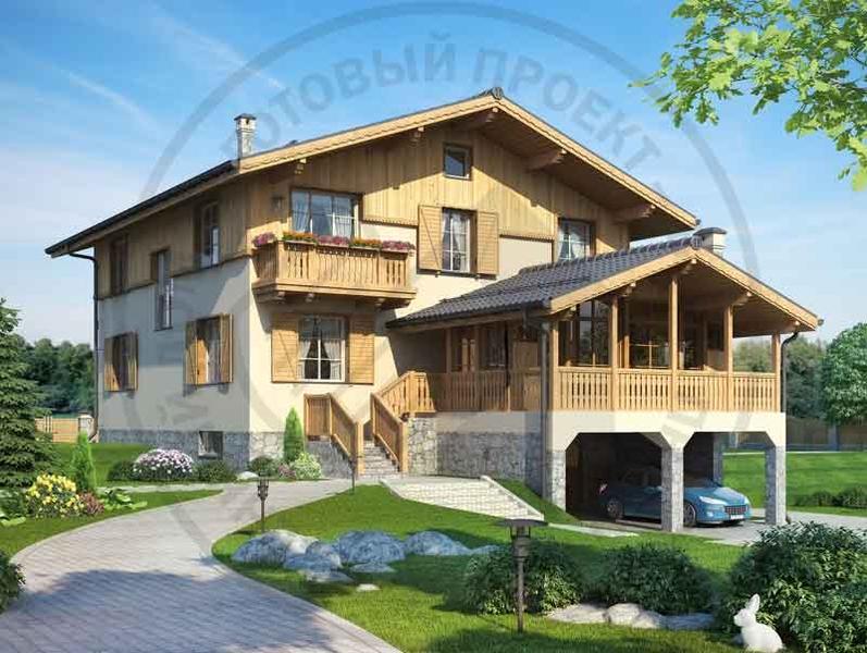 Коттедж в стиле альпийского шале для строительства на рельефе – симпатичный и необычный. Планировка отвечает принципам рациональности и комфорта. В цоколе размещены спортзал, мастерская и сауна. Под верандой первого этажа предусмотрен навес для двух автомобилей. Первый этаж традиционно запроектирован для домашних посиделок и приема гостей: тут расположены гостиная, кухня-столовая, спальня, которая может быть переоборудована в кабинет, а с просторной веранды можно любоваться живописной местностью. На втором этаже четыре спальни сгруппированы вокруг лестничного холла.