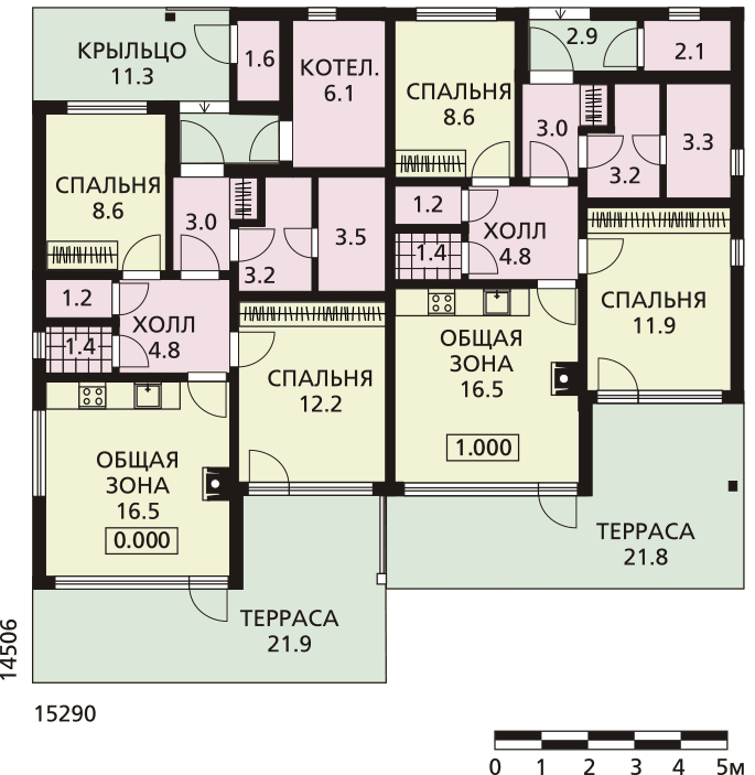 Необходима привязка по рельефу и корректировка фундамента в каждом конкретном случае. Возможна перепланировка в пределах ненесущих конструкций, размеров террас и т.п. Единство стиля с проектами H-3092-0 и T-9064-0 позволяет компоновать застройку при комплексном освоении территории.