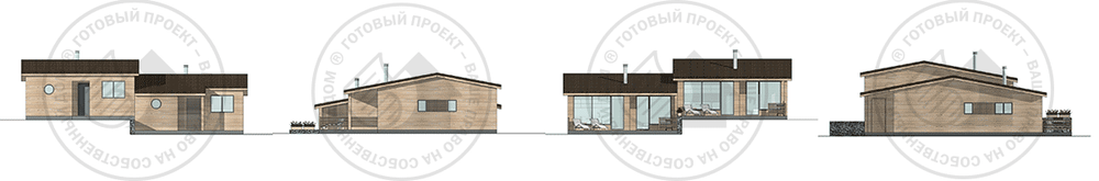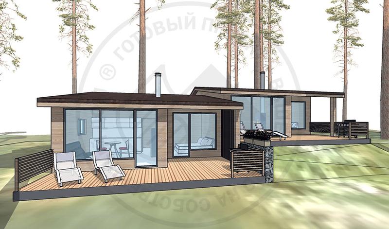 Компактный одноэтажный двухсекционный каркасный дом для временного или постоянного проживания семей из 3-4 человек (как вариант, для двух поколений одной семьи), предназначенный для строительства на рельефе с перепадом от 1 до 1,2 м. Одна из секций снабжена котельной.