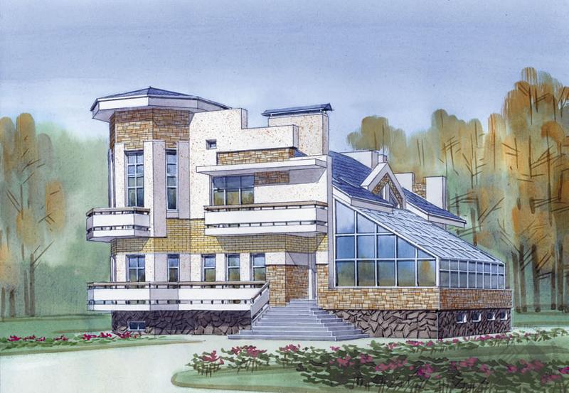 Большой, комфортабельный особняк, решенный в романтическом стиле. Четырехгранная угловая башня напоминает маяк, а террасы и балконы – палубы корабля. Большие плоскости остекления обращают внутреннее пространство дома во внешний мир. Необычный дом предполагает и незаурядных владельцев. В доме три этажа – два жилых и цокольный. В цокольном этаже расположен целый спортивный комплекс с бассейном, спортзалом, сауной и комнатой отдыха. Кладовая и топочная – функционально необходимые дополнения. Цокольный этаж имеет выход на улицу и удобную внутреннюю связь с домом. Первому этажу отведена гостевая роль. Огромный зимний сад с небольшим бассейном – дорогое, но такое приятное удовольствие. Мансардный этаж представляет собой приватную зону дома, где в просторный холл выходят четыре спальни и две ванные комнаты. Три спальни имеют дополнительное верхнее освещение, а две – выходы на балкон.