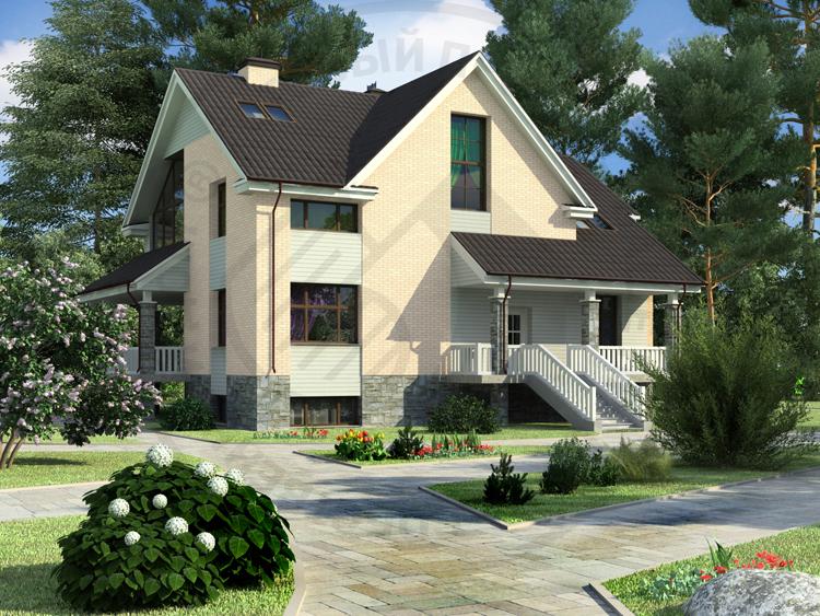Современный, солидный, просторный особняк на высоком цоколе. Удачная планировка отлично сочетается здесь с выразительными, красивыми фасадами. На первом этаже располагаются кухня-столовая и гостиная, из которой можно выйти на террасу, оборудованную камином. На втором этаже размещен зимний сад. В цоколе расположены служебные, технические помещения и небольшой спортзал. В мансарде запланированы холл и еще одна жилая комната. Наружные стены запроектированы с применением крупноформатного керамического кирпича, для которого характерны небольшой вес и отличные теплотехнические свойства.