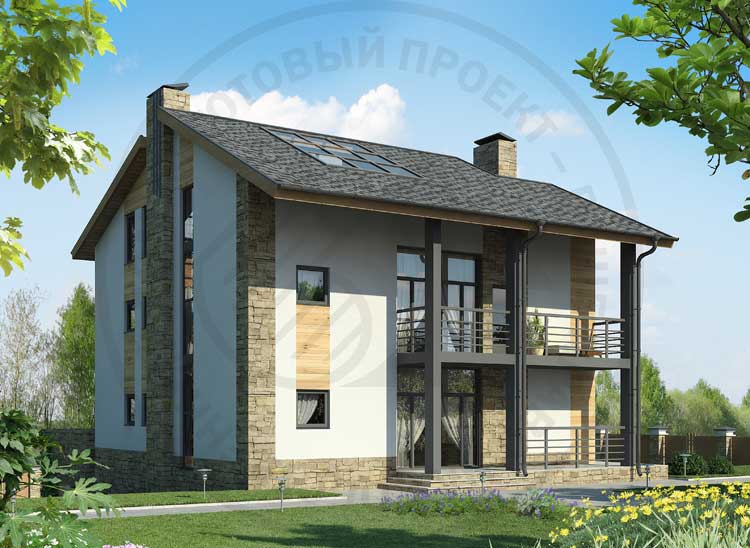 Красивый стильный особняк для строительства на рельефе с достаточно большой поверхностью остекления. Оно и внешне эффектно, и формирует выразительный интерьер. Для дома характерна рациональность объемно- планировочного решения, высокий уровень комфортности.