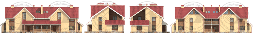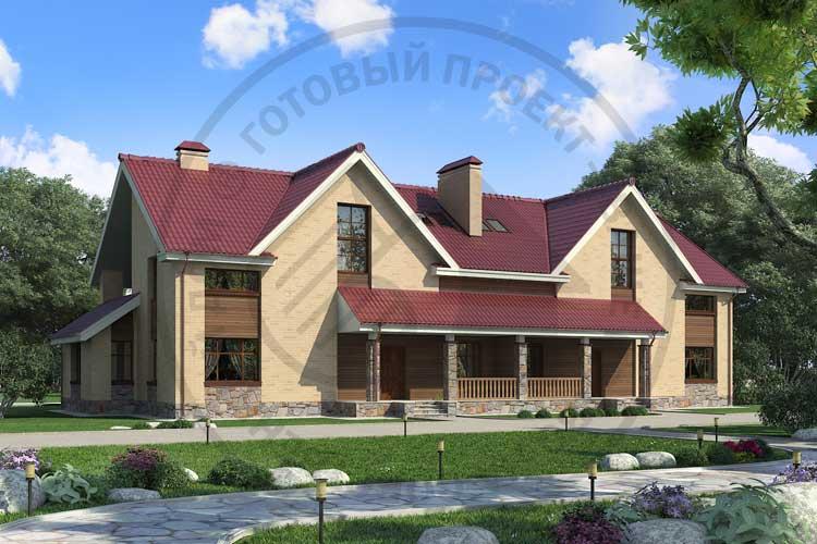 Дом для двух семей с общей котельной содержит симметрично расположенные помещения. По боковым фасадам первого этажа обустроены кабинеты и гостиные, ближе к центру — кухни, прихожие и спальни с выходом на отделённые друг от друга террасы. Второй этаж традиционно спальный: три спальни в каждом блоке с двумя санузлами. Мансардный этаж отдан под кладовые.