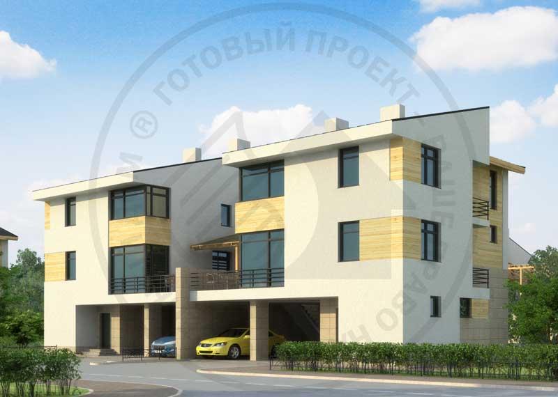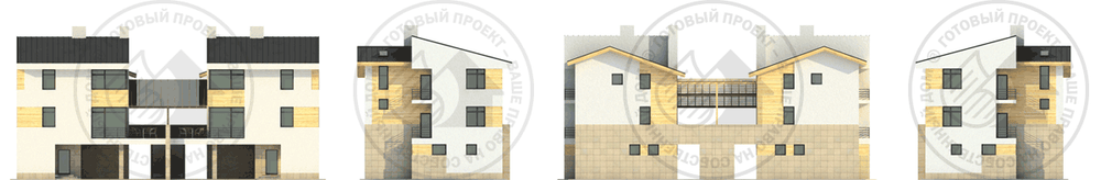 Данный проект - вариант блокировки существующего J-1571-0, в данном случае представлен дом на две семьи. Из каждого блока имеется свой выход и навесы для автомобилей. На первом этаже расположены технические помещения. Второй этаж - зона домашних посиделок и приема гостей, к чему располагает большая угловая гостиная, сообщающаяся с кухней-столовой, из которых можно выйти на почти тридцатиметровую террасу. Спальня на первом этаже может служить гостевой спальней. Третий этаж - традиционно зона отдыха: здесь находится три спальни и два санузла, сгруппированные вокруг лестничного пролета.