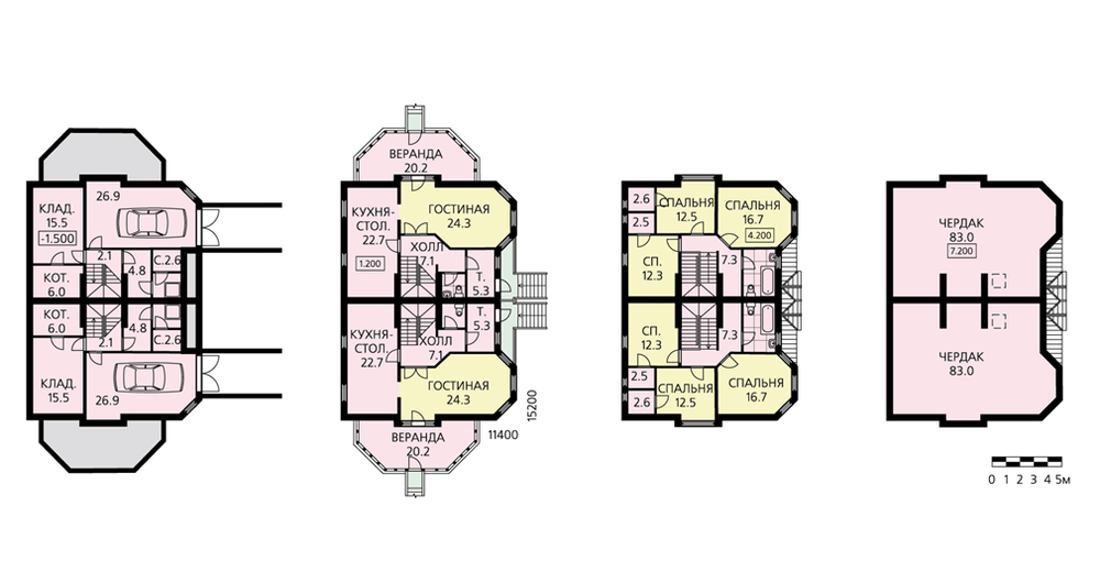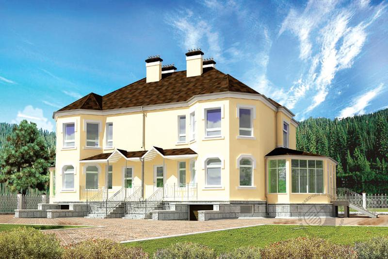 Предлагаемый проект представляет собой вариант сблокированной постройки. Он может привлечь внимание владельцев смежных участков или родственников, мечтающих жить рядом, но не вместе. Строительство таких домов оправдано и с точки зрения экономической целесообразности. В данном случае предлагается вариант блокировки двух совершенно автономных зданий с зеркальной планировкой. Каждое из них имеет свою котельную, гараж и полный набор помещений, необходимых для комфортной жизни и полноценного отдыха. Но при желании эта изолированность может быть минимизирована. Вместо двух котельных можно оборудовать одну и создать связь между жилыми помещениями дома. Возможны и некоторые другие изменения планировки дома.