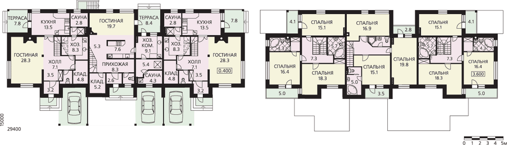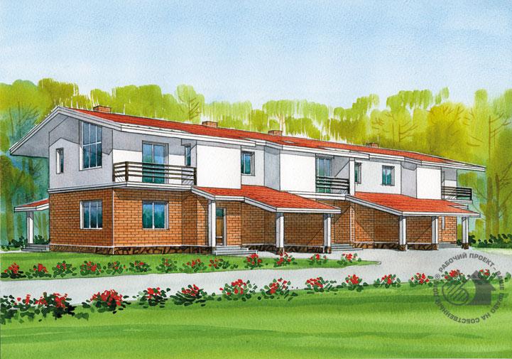 Дом состоит из трех секций, каждая из которых представляет собой двухуровневую квартиру. Две торцевые секции зеркальные, они имеют одинаковые планировки и площади – 71.5 м2. В середине расположена одна рядовая секция, площадь и планировка которой несколько отличается. Объединяет же их одинаково высокий уровень комфорта. Каждая из трех секций-квартир имеет одинаковый состав помещений. Предусмотрен навес для машины. На первом этаже гостевая зона с гостиной и кухней дополнена хозяйственными помещениями и сауной. В мансарде запроектированы по три спальни и две ванные комнаты. Такие секционные дома могут стать очень удачным решением при застройке коттеджных поселков и возводятся наравне с двух-, четырех- и многосекционными домами. Готовый проект сэкономит не только ваши деньги, но и время на проектирование. А различные варианты наружной отделки позволят придать индивидуальность каждой из построек.
