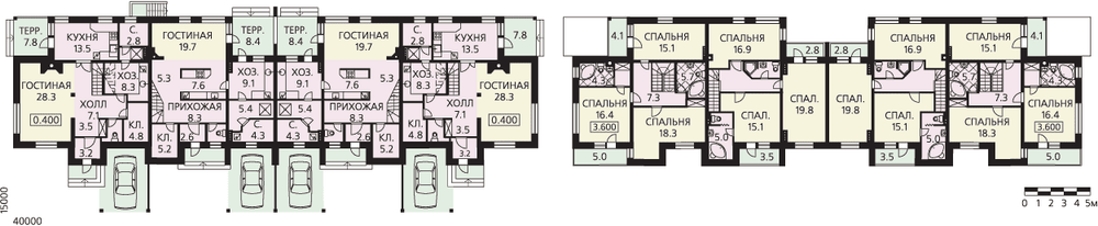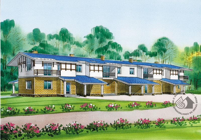 Этот сблокированный дом имеет четыре секции, расположенные в линейку. В данном предложении использованы две секции: торцевая и рядовая и их зеркальные варианты. По краям расположены торцевые секции с зеркальной планировкой, их площадь несколько больше, чем площади рядовых секций, расположенных в центре плана. Общая площадь торцевой секции 151 м.кв., рядовой - 146.7 м.кв. Несмотря на некоторые различия в планировках, состав помещений и уровень комфорта одинаковый. Перед каждой из квартир предусмотрен навес для машины. На первом этаже гостевая зона с гостиной и кухней дополнена хозяйственными помещениями и сауной. В мансарде запроектированы по три спальни и две ванные комнаты. Под частью дома, со стороны кухни предусмотрен тех. подвал для коммуникаций. Такие дома могут стать очень удачным решением при освоение и застройке больших территорий, значительно сокращая время и затраты на проектирование.