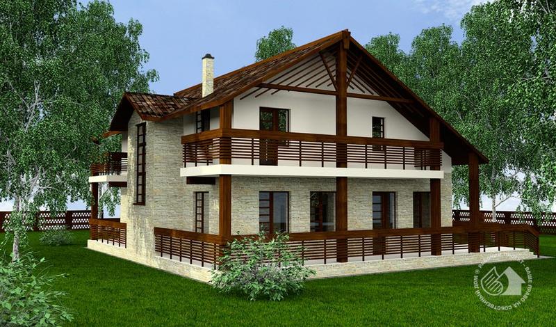 Комфортабельный загородный дом, выполненный в современной стилистике в светлых тонах с использованием деревянных архитектурных деталей и натурального камня. Подвала в доме нет, второй, частично мансардный этаж используется полностью вплоть до стропил. Наличие больших крытых террас первого и мансардного этажей – отличительная черта планировки, позволяющая не только комфортно проживать в этом доме, но и с удовольствием отдыхать. На первом этаже жилые помещения удобно соседствуют с гаражом и бойлерной, они связаны через небольшой тамбур-шлюз. Гостиная и кухня-столовая решены в одном помещении, условно поделенном на две части камином. Санузел и гардеробная выходят в небольшой лестничный холл. Кабинет либо гостевая спальня дополняют планировку этажа. В мансарде расположены спальни. Спальня хозяев сблокирована с ванной и гардеробной и имеет свой просторный балкон. На две детские спальни предусмотрена еще одна ванная комната, одна из спален имеет небольшой крытый балкон.