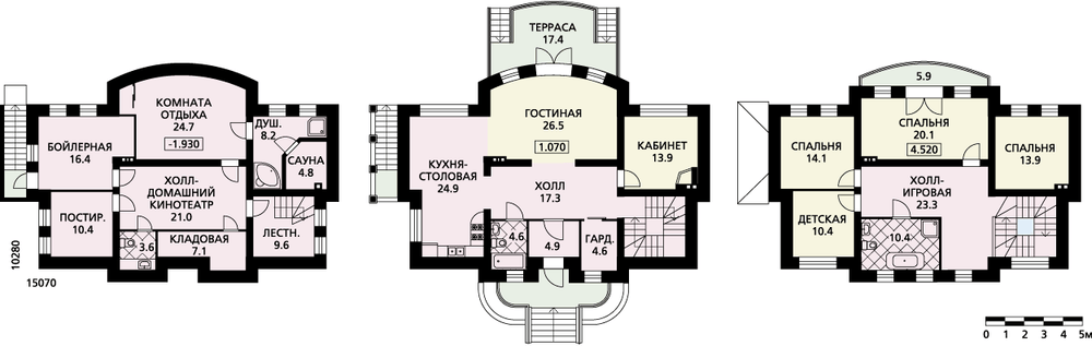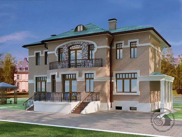 Архитектурная концепция этого дома привязана к стилю модерн. Изящный рисунок окон, изысканные кованые решетки, утонченная цветовая гамма создают запоминающийся, очень выразительный образ дома, дома, располагающего к несуетному гармоничному бытию. Проектом предусмотрены два этажа, подвал и холодный чердак. Подвал поделен между зоной отдыха и техническими службами. К первым относится сауна с душевой, комната отдыха с бильярдной и домашний кинотеатр, ко вторым – постирочная и бойлерная. Первый этаж – репрезентативная часть дома с просторным центральным холлом, гостиной и кухней-столовой. Все эти помещения собраны в один объем, позволяющий создать очень интересное свободное интерьерное пространство. Снаружи оно дополнено красивой террасой. Небольшая гостевая спальня с камином удачно вписана в планировку этого этажа. Мансарда отдана спальным помещениям. В центре расположена великолепная спальня хозяев дома, по бокам – еще три небольшие спальни.