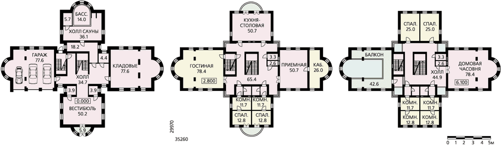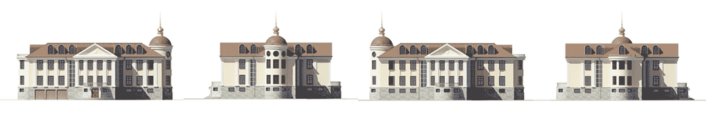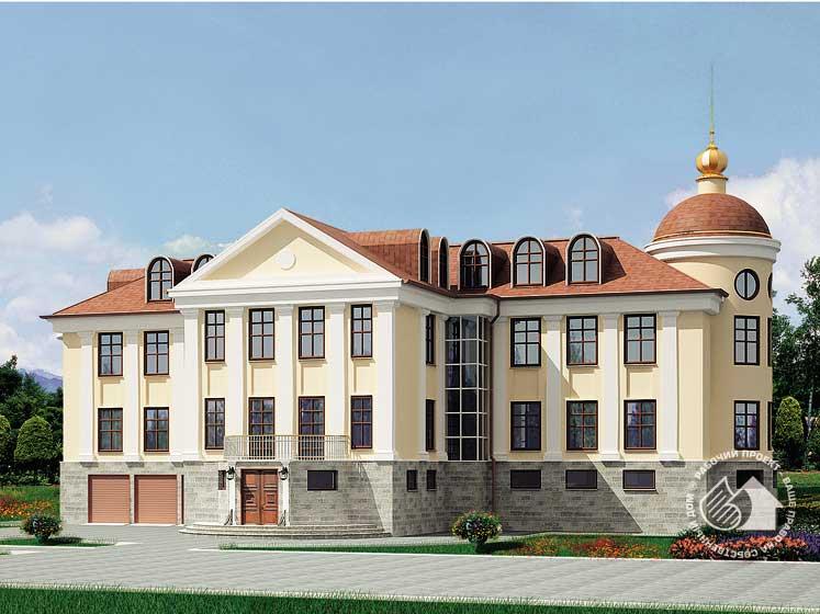 Особняк дворцовой архитектуры, размах которого ощущается и в его габаритах, и в планировке, и во внешнем облике. Такой особняк вполне может стать представительской резиденцией преуспевающей компании. А при некоторой корректировке может использоваться как административное здание. В предложенном варианте это жилой дом для большой очень состоятельной семьи. В доме три этажа и мансарда. Большой гараж на несколько автомобилей, обширные кладовые, сауна и бассейн в цокольном этаже создают дополнительный комфорт будущим хозяевам. На первом этаже расположены гостиная, кухня-столовая, кабинет с приемной и блок жилых комнат. Большая площадь гостиной вполне позволит совместить ее с кухней-столовой. Третий этаж – приватная часть дома со спальнями, балконом второго света гостиной и домвой церковью. Назначение мансарды проектом не определено, но площадь и освещенность позволят оборудовать и использовать это пространство по усмотрению владельцев дома.