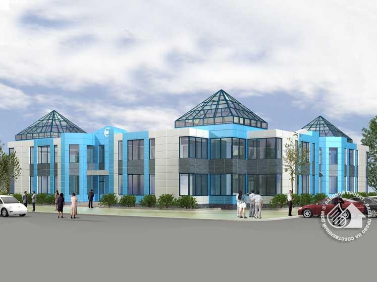 Здание представляет собой двухэтажное сооружение, за основу планировочного решения которого принят архитектурный блок-модуль, позволяющий при соответствующей компоновке добиваться различных объемно-пространственных решений с богатой пластикой фасадов. При проектировании блок-модуля соблюдена жесткая симметрия в объемном решении фасада. В наружной отделке использованы металлические фасадные панели, которые в сочетании с большим количеством стекла создают современный образ здания в стиле техно. В данном проекте планировочная композиция составлена из трех двухэтажных блок-модулей. Архитектурным акцентом здания является центральный вход для посетителей с остекленной доминантой шатра на кровле. Планировка предполагает многофункциональное и вариативное использование этого здания. Здесь могут располагаться офисы, выставки, городские службы. Зона свободной планировки как раз и предполагает гибкую разбивку помещений под конкретного заказчика. Каждый блок-модуль оснащен отдельным входом с первого этажа.