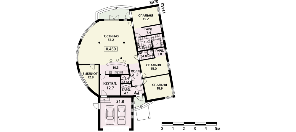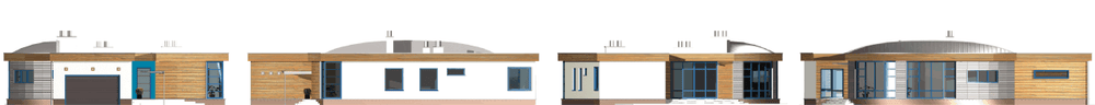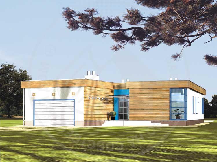 Одноэтажный дом со встроенным гаражом на две машины, без подвала, предназначен для семьи из 4–5 человек. Это просторное здание, запроектированное в форме круга, перерезанного прямоугольником, который вмещает в себя спальную зону. В дневной части запланирована гостиная с выходом на террасу, кухня со столовой и кабинет, а также хозяйственная часть. В спальной зоне предусмотрено три спальни и две ванные.