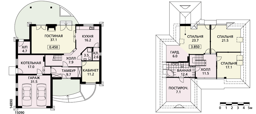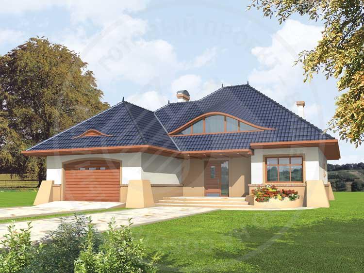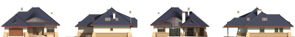 Современный европейский дом, в стилистике которого присутствуют элементы модерна, с просторной жилой мансардой, без подвала, с гаражом, предназначен для семьи из 5–6 человек. Дневную зону на этаже поделили между собой гостиная и кабинет. Пол в гостиной ниже уровня пола в других помещениях. В мансарде расположена спальная зона – три спальни, а также ванная с постирочной.
