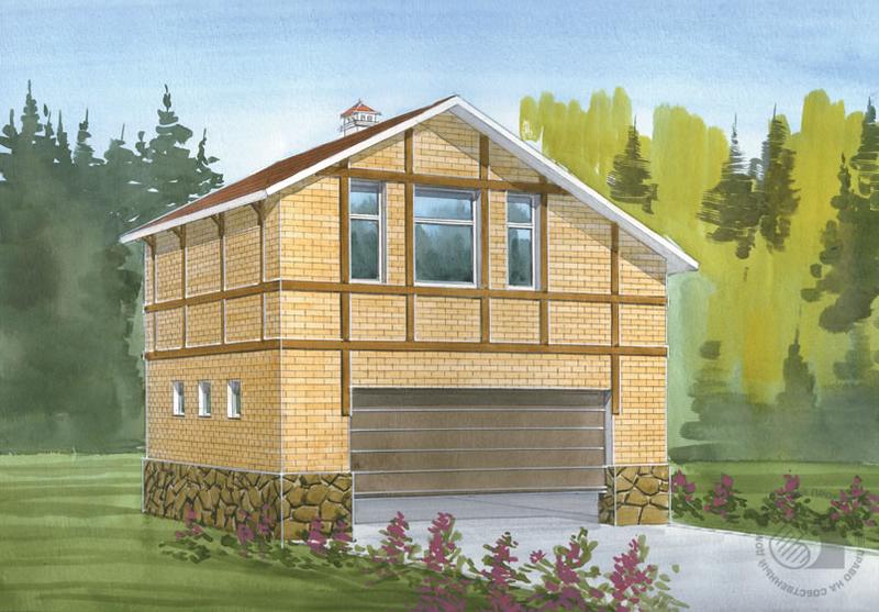 Симпатичный двухэтажный гараж является частью усадебного комплекса. И рассматривать его нужно вместе с проектом жилого дома I-1069-0. Этим объясняется и единая стилистика фасадов этих сооружений с элементами декоративного фахверка, и отсутствие встроенного гаража в доме. Первый этаж решен как гараж на две машины, кроме ворот здесь предусмотрена дверь на противоположном фасаде и три окна на боковом. Мансардный этаж это компактная, но достаточно комфортабельная квартира для обслуживающего персонала. В ней предусмотрена небольшая гостиная, спальня, кухня и санитарный узел. Вся планировка выполнена в перегородках, поэтому она может быть легко откорректирована по желанию владельцев усадьбы.