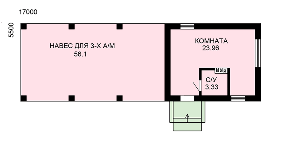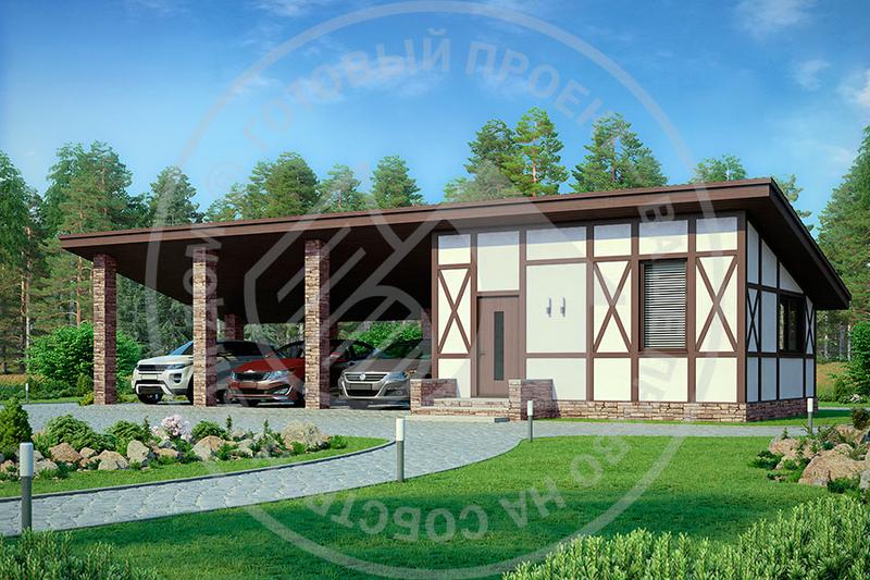 Навес для трех автомобилей целесообразно сделать автономным и независимым от дома. Его можно расположить в наиболее удобном месте на участке. Строение подойдет практически к любому дому, но более гармонично будет смотреться в компании с домом с односкатной кровлей. Рядом с навесом запланированы помещение для охраны, санузел.