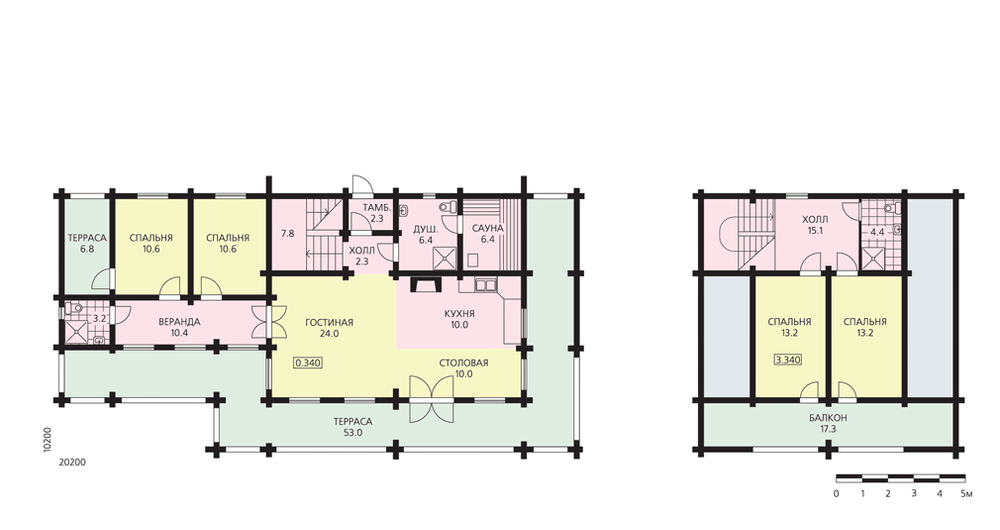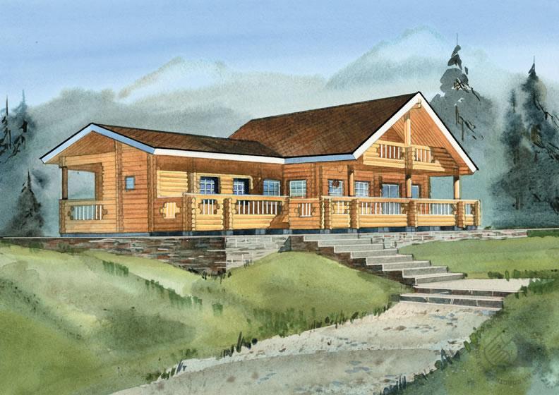 Небольшая, очень симпатичная семейная гостиница-мотель. Такая гостиница может использоваться как мотель для отдыха на оживленной трассе, а может быть частью гостиничного комплекса или базы отдыха в живописном курортном районе. Планировку дома условно можно разделить на две части: гостевую – общую для всех обитателей гостиницы – и жилые номера. Гостевая часть расположена на первом этаже, она представлена гостиной, кухней и столовой. Изолированно находится блок с сауной и душевой. Жилая часть первого этажа – две спальни и ванная комната. По периметру с двух сторон здание опоясывает терраса, прикрытая далеко выступающими скатами кровли – очень удобное место отдыха в плохую погоду. В мансарде, находящейся над гостиной, расположены еще два номера и душевая. Из комнат можно выйти на балкон, также прикрытый скатами кровли.
