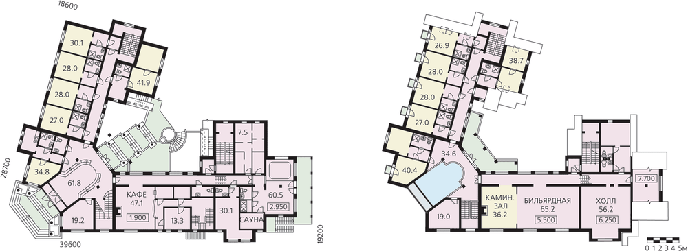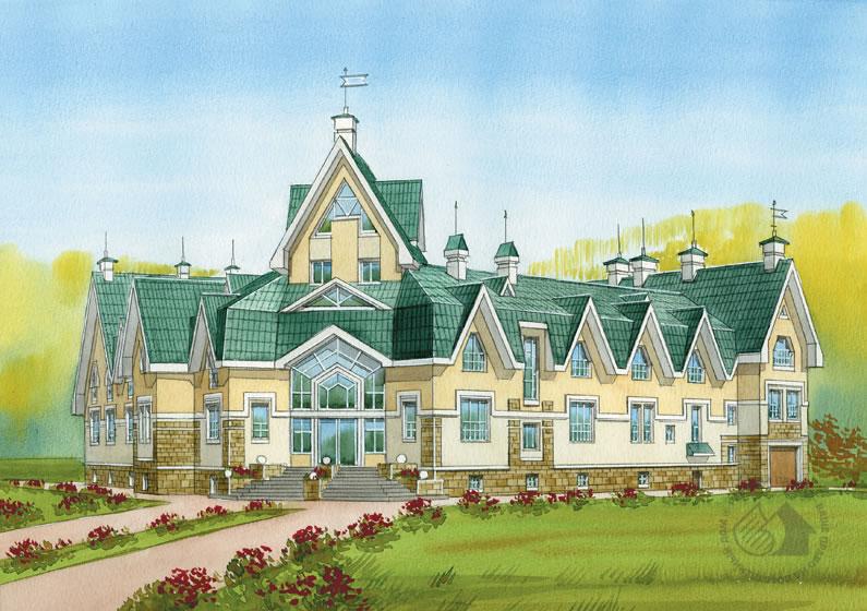 Комфортабельная гостиница с цокольным этажом представляет собой сооружение, оснащенное всеми видами инженерного обеспечения и сочетающее несколько функциональных зон. Планировочно она разделена на два блока: жилой и блок обслуживания. Между собой они связаны двусветным холлом, который также является сквозной проходной зоной между парадным входом и выходом во внутренний дворик и на летнюю террасу. Жилой блок состоит из 11 номеров, в том числе 8 однокомнатных и 3 двухкомнатных, и однокомнатной квартиры для постоянного проживания семейной пары. Блок обслуживания включает в себя кафе, зону для совместного проведения досуга, оздоровительный и хозяйственно-бытовые блоки. Оздоровительный блок состоит из помещения сауны с бассейном, спортивно-тренажерного зала и мед. кабинета. Зона проведения досуга включает в себя бильярдную, каминный зал, солярий-террасу. Предусмотрена зона хоз. обслуживания.