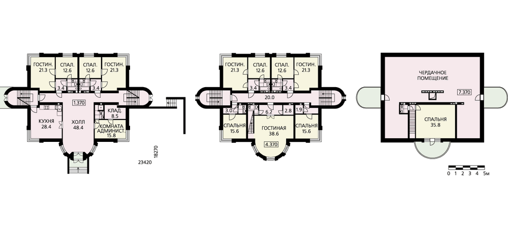 Небольшая комфортабельная гостиница, рассчитанная на семь номеров. Четыре номера двухкомнатные с гостиной, спальней и санитарным блоком и три – однокомнатные. Один из этих трех номеров расположен на мансардном этаже и имеет комнату большой площади и балкон. Здание гостиницы четырехэтажное. Подвал предусмотрен для служебных и технических целей, на планах он не показан. На первом и втором этажах размещены гостиничные номера. Вход в здание решен через красивую полукруглую ротонду. По одну сторону от центрального холла расположено помещение администрации, по другую – кухня, два двухместных номера – напротив входа. На втором этаже, кроме четырех номеров, находится просторная гостиная, оформленная полукруглой ротондой. Из нее по небольшой узкой лестнице можно подняться в единственный номер мансарды. Мансарда используется частично, кроме уже упомянутого номера с большой комнатой, других помещений здесь нет. Архитектурно-планировочное решение, заложенное в проекте, позволит возвести эту гостиницу и в городской черте, и за городом, на трассе или в придорожном коттеджном поселке.